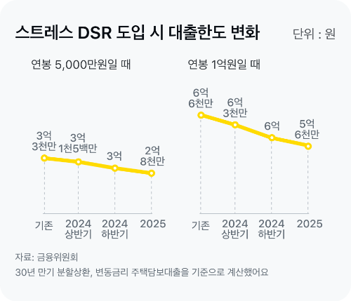 스트레스 DSR은 상환비율을 계산할 때 금리 상승의 가능성을 반영하는 제도예요. 변동형 대출의 경우 나 중에 지금보다 금리가 더 올라갈 수도 있는데, 그때 의 리스크까지 고려해서 대출한도를 정하겠다는 의 미예요. 대출한도 이만큼 줄어들어요 현재 금리에 스트레스 금리를 추가해 DSR을 산정하 면 예상 이자가 늘어나고, 소득 대비 대출금이 차지하 는 비중도 높아지기 때문에 대출 한도가 줄어들어요.