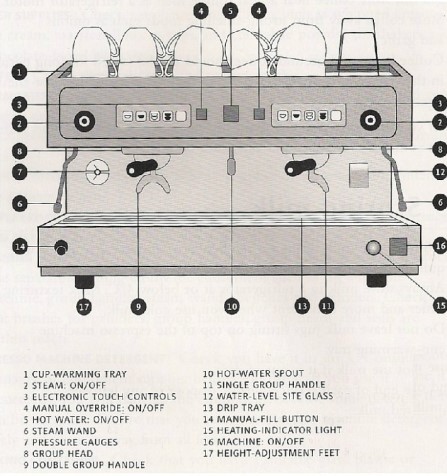 상용 에스프레소 머신의 구조와 각 부분에 대한 설명.